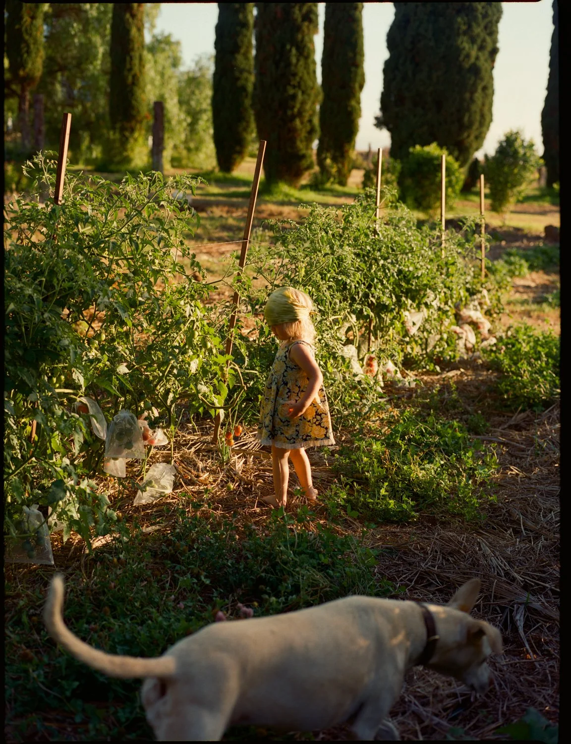A young girl with blonde hair wearing a yellow headscarf and floral dress, holding a piece of red fruit, standing outdoors in sunlight.